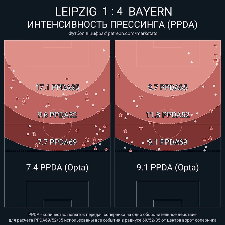 РБ Лейпциг 1-4 Бавария ▪ Вероятность победы: 0.25% - 98.54% ▪ Явные голевые моменты (opta): 0 - 7 ▪ Deep completions: 8 - 13 ▪ Наклон поля (field tilt): 57% - 43% ▪ PPDA (Opta): 7.4 - 9.1