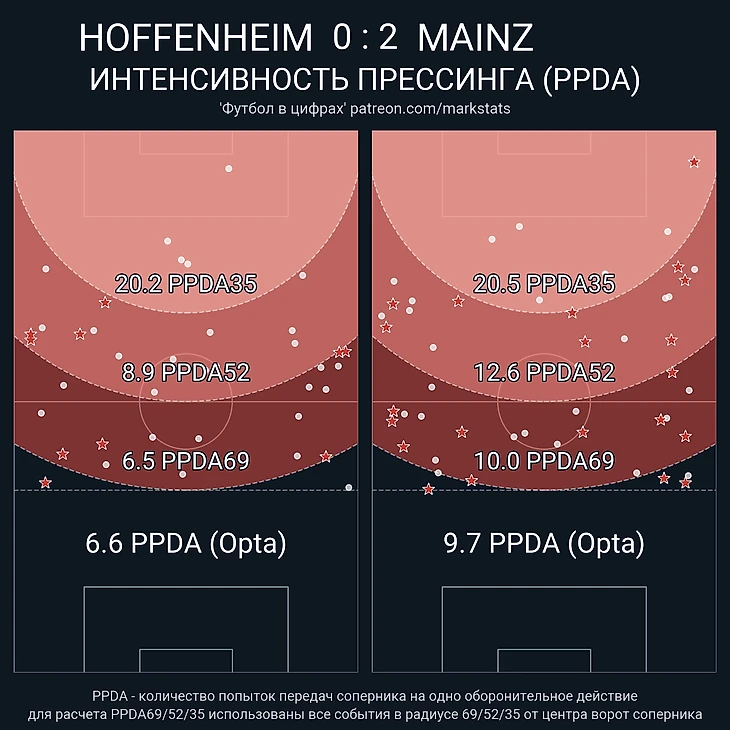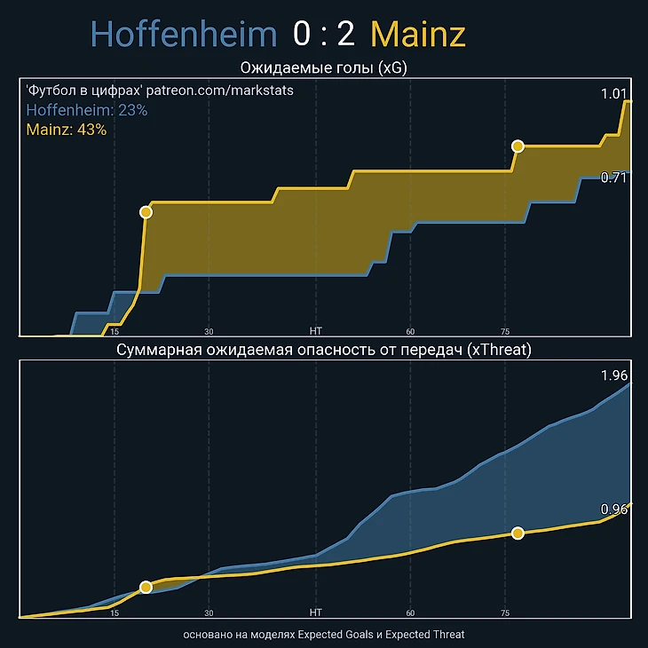 В 4 матчах Кельна из 4 играл ОЗ да (в сезоне 19/20 67.5% матчей 23/34; 20/21 61.7% матчей 21/34) В 3 матчах Фрайбурга из 4 играл ОЗ да (в сезоне 18/19 64.7% матчей 22/34; 19/20 58.8% матчей 20/34; 20/21 58.8% матчей 20/34) Хоффенхайм 0:2 Майнц 05 ▪ Вероятность победы: 23.16% - 42.82% ▪ Явные голевые моменты (opta): 0 - 1 ▪ Deep completions: 6 - 4 ▪ Наклон поля (field tilt): 55% - 45% ▪ PPDA (Opta): 6.6 - 9.7