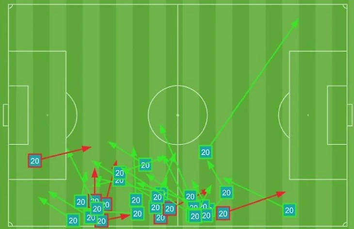 Но. Ноль. Ноль ударов в створ ворот (соперника) за два тайма. Ноль ударов в створ из в принципе всего лишь трёх ударов. Можно сокрушаться по этому поводу. Причины понятны: чтобы уметь контратаковать (а именно на контратакующий формат Куман сделал ставку при выборе состава) нужно практиковать такой формат игры. Ширина или широта продуктивны, когда передачи идут вперёд и на обострение, а не назад. Здесь будет карта передач Роберто для наглядной иллюстрации моей мысли.