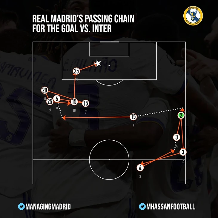 Также Интер использовал уязвимость Мадрида на левом фланге. Во-первых, там играл не профильный латераль, а во-вторых, Винисиус не отрабатывал в обороне. Вероятнее всего - это было решением Анчелотти, что Вини будет располагаться выше всех и будет готов в любой момент убежать в контратаку. И пару раз он убегал, но безрезультатно. В этой зоне отрабатывал Модрич, которого в итоге иногда не хватало в центре.