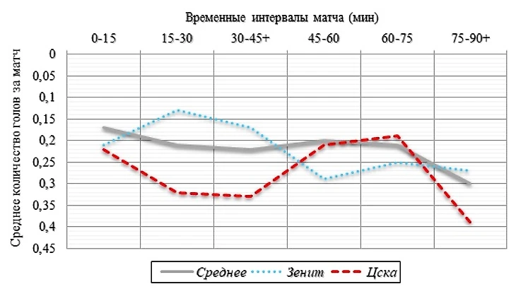 Принцип оценки эффективности достаточно прост. Расиль посчитал, сколько в среднем забивали и пропускали «Зенит» и ЦСКА в разные 15-минтутные отрезки матчей в сравнении с 35 другими клубами, чья статистика вошла в исследование.