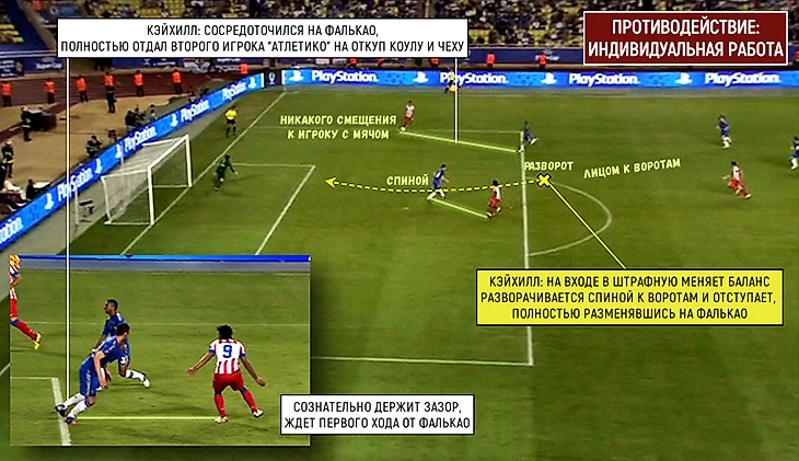 Вот классный пример из Суперкубка Европы, когда Фалькао настолько затерзал оборону «Челси» (уже забил три), что во втором тайме Кэйхилл действовал так: