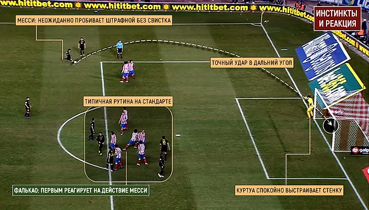 Способность не выключаться из эпизода и реагировать первым проявлялась в разных декорациях, иногда скорее забавных. Штрафной у ворот «Атлетико», Куртуа неторопливо выстраивает стенку, подавляющее большинство игроков занято рутиной стандарта. Кроме двоих. Месси, решившего пробить с фланга без свистка, и, как вы уже догадались, Фалькао, заметившего дерзкий ход аргентинца первым: