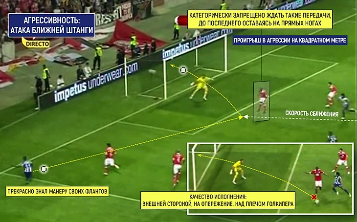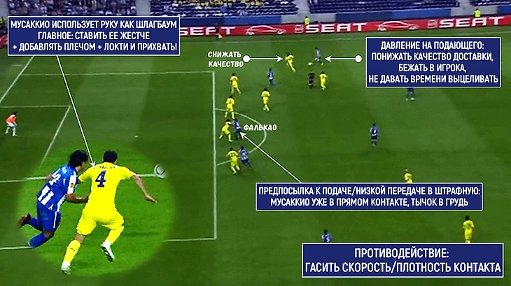 Пример индивидуального противодействия при подачах – Мусаккио сначала ткнул колумбийца в грудь, сбил с разгона, затем опередил на мгновение в эпизоде: