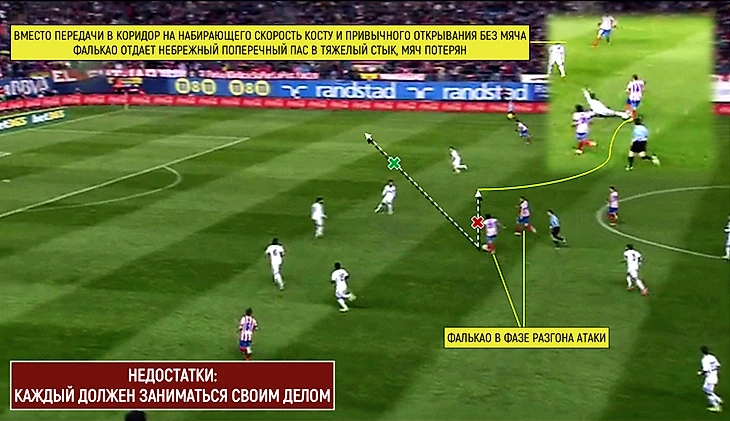 За пределами штрафной Фалькао пытался получать больше мячей и старался разыгрывать некоторые ситуации самостоятельно, что далеко не всегда было эффективным атакующим инструментом. Все-таки розыгрыш атак и контратак – дело не совсем его, в таких сценариях гораздо эффективнее задействовать его на рывках без мяча. Здесь он отдает короткую неточную передачу вместо того, чтобы запустить Косту разворотом через доступный коридор: