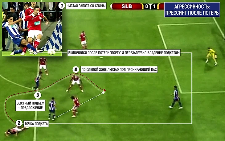 Переход мяча, отчаянная и успешная атака правого защитника в подкате, мгновенно поднимается и бежит открываться по слепой зоне Луизао под проникающую передачу.