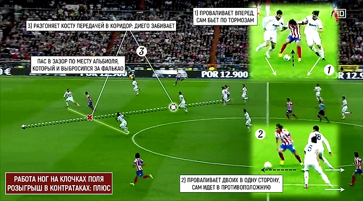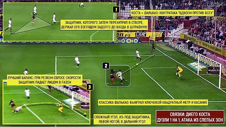 Пример контратаки «вдвоем против всей обороны», когда Коста идет по флангу, а Фалькао открывается в центре: