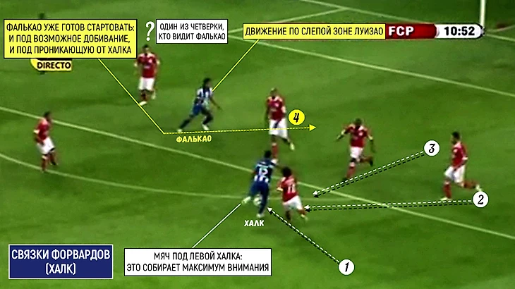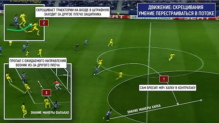 Петляя в определенном темпе, Фалькао проверил оборону соперника под любой тип паса, который привык получать: сначала отскочил в недодачу, затем сочинил угрозу в зоне за спиной, резко сломал маршрут и поднялся на радиус под диагональ назад, а закончил на дальней штанге под навес. Подстроиться под любой тип паса – квинтэссенция движения колумбийца. Мяч он мог в итоге не получить, но галочки в зонах проставил. Понимание оптимальной координаты – часть той версии форварда.
