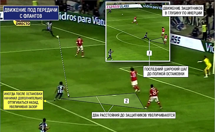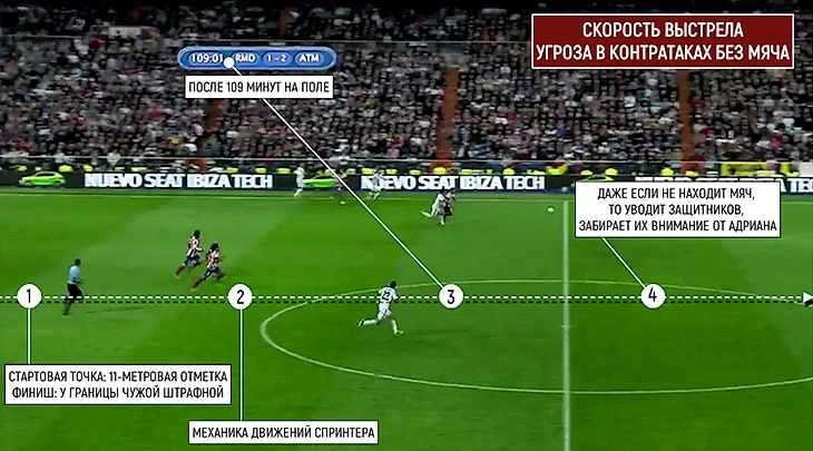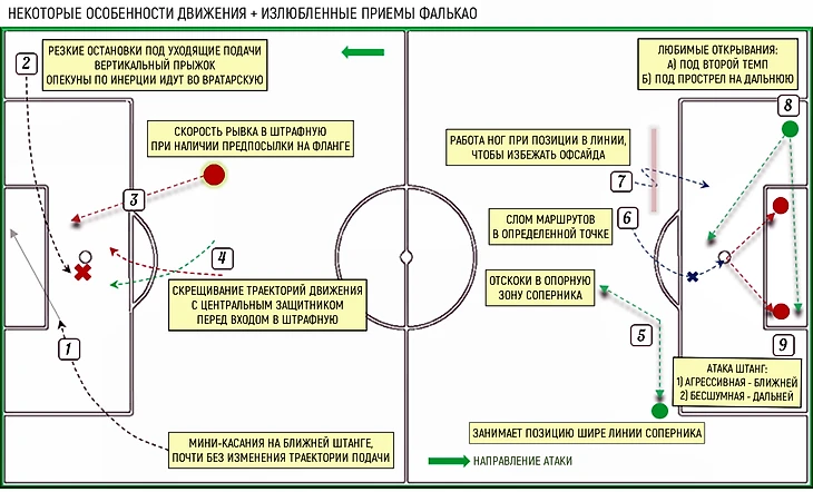 3 – указанное расстояние на рывке важно было проходить на максимальной скорости, выиграть корпус у защитников при входе в штрафную или уже в ней. После таких ускорений Фалькао выбирал вариант поведения: штангу, которую выгоднее атаковать, точку остановки и сброса скорости, где и как начинать подстраиваться под передачу;