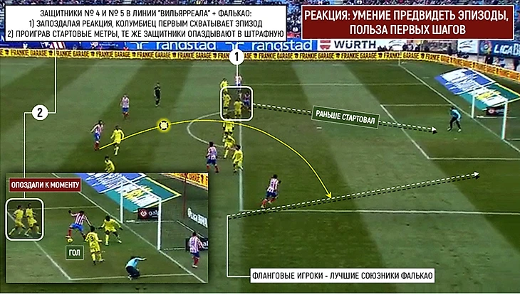 Защитники № 4 и № 5 в ней – ближние к Фалькао, который уже готов к рывку. Те же защитники выделены и на вставке: форвард раньше них стартовал с границы штрафной площади. Так и сложилась ситуация, в которой они опоздали к моменту, а Радамель спокойно забивал из вратарской.