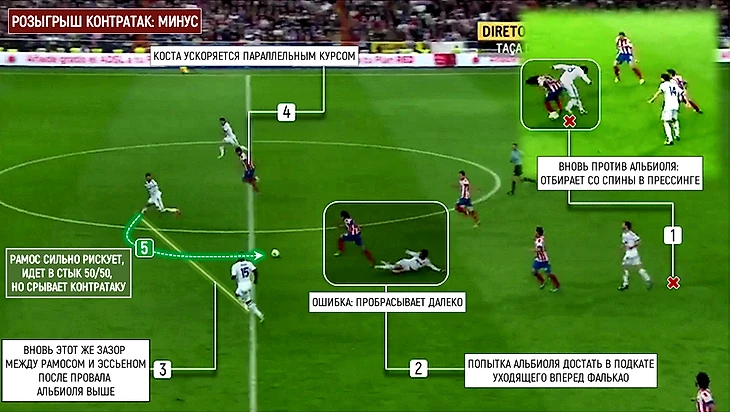 Уходя от подката опомнившегося Альбиоля, Радамель пробрасывает мяч далековато, что дает шанс Рамосу. Рискованная ситуация 50/50, но защитник «Реала» прерывает быстрый отрыв, чисто сыграв в стыке. Легко представить, что – выиграй эту ситуацию Фалькао – они вместе с Костой остались бы два в два с крайними защитниками и огромной пустой зоной в центре после провалов Альбиоля и Рамоса.
