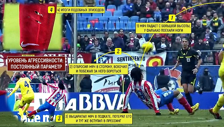 В одном и том же эпизоде Фалькао мог бороться в нескольких его фазах, вот показательный пример из первого матча эры Симеоне на «Кальдероне»: