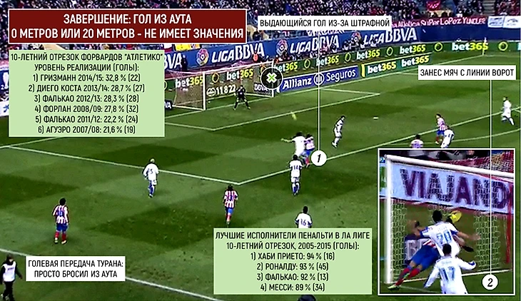 Дополнительно – статистика реализации ведущих форвардов «Атлетико» той эпохи (2 из 6 лучших сезонов за колумбийцем) и стабильность «Эль Тигре» при реализации пенальти. При первом голе Туран просто бросил аут, на который Фалькао откликнулся голом из-за штрафной первым же касанием, при втором – форвард нашел способ добить мяч с линии ворот.