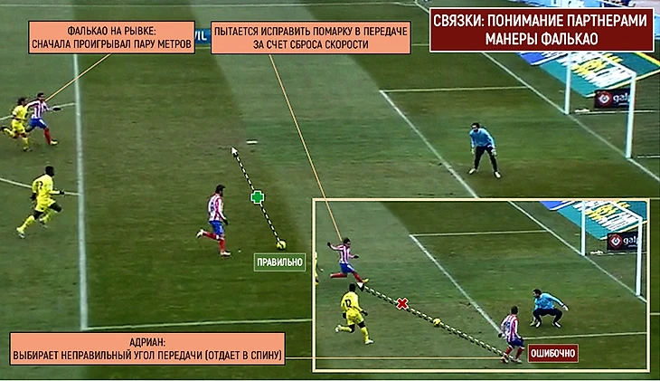 За несколько минут до этого была ситуация-близнец, когда Диего не отдал передачу и Фалькао откровенно напихал ему за это. Колумбийца активно высматривали еще в глубине поля, ожидая начала рывка (первая вставка). Он ускорялся на передачу вместе с защитником, но при остановке с рывка Фалькао забивает левой и под сложным углом, а игрок обороны летит лицом в газон.