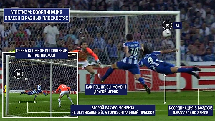Спиной к воротам, из крайне тяжелого положения, он вынырнул из-за спины огромного Луизао и погасил мяч в землю. Забить такое под силу только фокусникам. Еще один пример кошачьего атлетизма колумбийца – на вставке и глазами подающего Халка: Радамель буквально согнул себя в дугу, чтобы достать его подачу. Кажется, вместо шипов в его бутсы вмонтированы пружины.