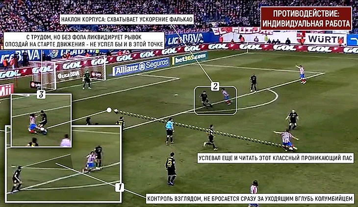 А вот пример индивидуальной обороны от Бускетса, когда он понимает, что Фалькао готов рвануть ему за спину под проникающую передачу: