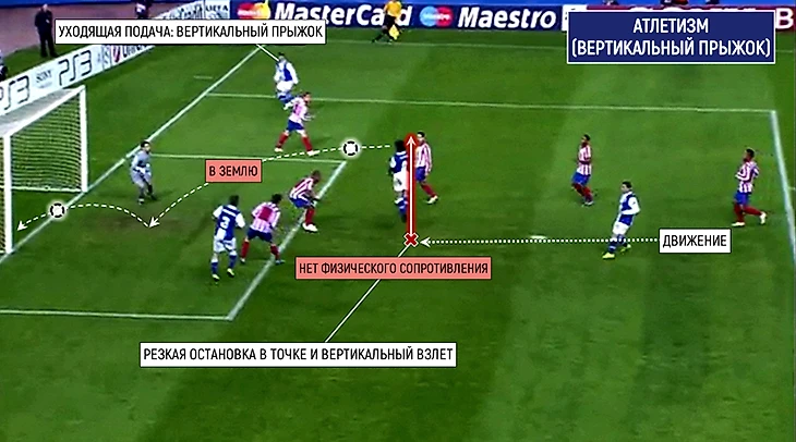 Вертикальный прыжок – это баскетбольный навык, который Фалькао интегрировал в стиль и совершал после резких остановок в точках с наименьшим сопротивлением. Простейшая цепочка: бежит в общем потоке – бьет по тормозам – резкий взлет – поймал мяч в верхней точке. Украшение эпизода – удар в землю.