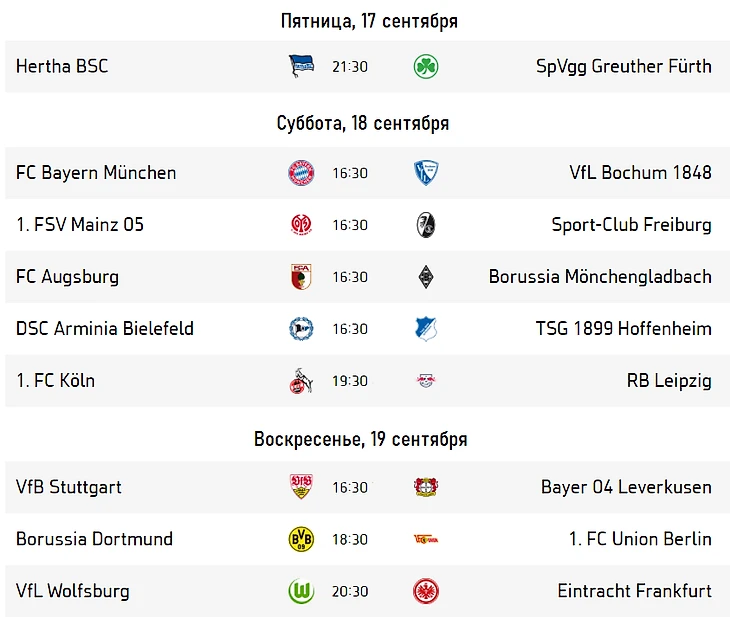 Пятый тур открывают аутсайдеры «Герта» и «Гройтер Фюрт», интересное противостояние у неожиданных лидеров «Майнца» и «Фрайбурга» (четвертое и пятое места соответственно), в гости к мюнхенской «Баварии» приедет новичок лиги «Бохум». «РБ Лейпциг» будет пытаться реабилитироваться за неудачный старт в Лиге чемпионов и поедет в Кёльн, вот только «козлы» в Бундеслиге начали отлично и после четырех туров идут на седьмом месте, лёгкой поездки «быкам» ждать не стоит. В воскресных играх пристально последим за участниками еврокубковых турниров (обзоры всех матчей немецких команд можно почитать в предыдущих постах нашего блога или по ссылкам: ЛЧ день 1, ЛЧ день 2, ЛЕ, ЛК): в Дортмунд отправится берлинский «Унион», в «Вольфсбург» прилетят «орлы» из Франкфурта, а «Байер» поедет к «Штутгарту».