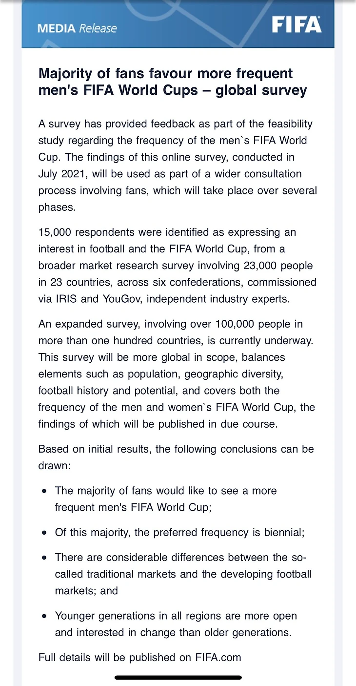 Там говорится об опросе, в котором участвовали 23 тысячи человек из 23 стран. В итогах ФИФА утверждает: большинство за более частые ЧМ. Самый популярный вариант – раз в два года.