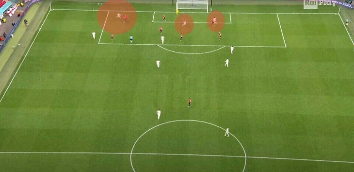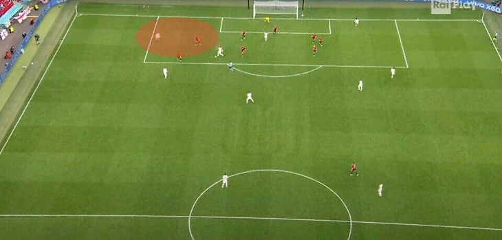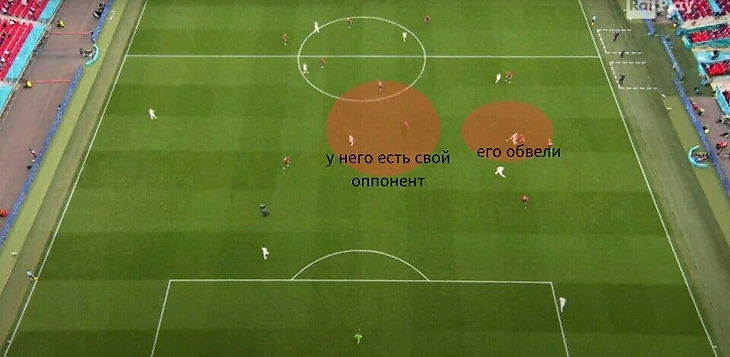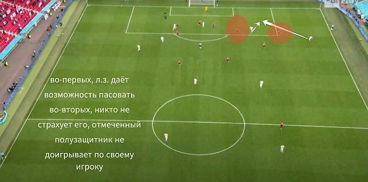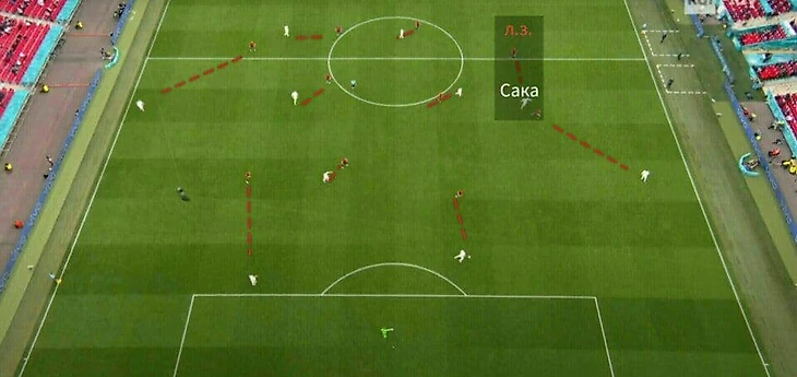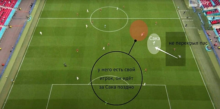 Если левый защитник не пошёл за ним, остальные игроки должны перестраиваться и подстраиваться. В примере ниже мы видим обратное. Сначала левый полузащитник Чехии не перекрыл пас на Сака, хотя этого требовало ситуация. Можно было перекрыть тенью и давить на игрока с мячом, но он этого не сделал. Второе: полузащитник (в красной кругляшке), тоже мог адаптироваться под ситуацию и перестроиться на Сака, что он и сделал, но поздно - Сака свободно принял мяч и развернулся.