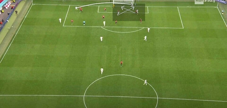 Подача оказывается не такой, как хотел Сака, но Грилишу удаётся скинуть мяч головой на Кейна, который открылся под ним: