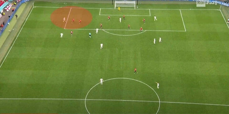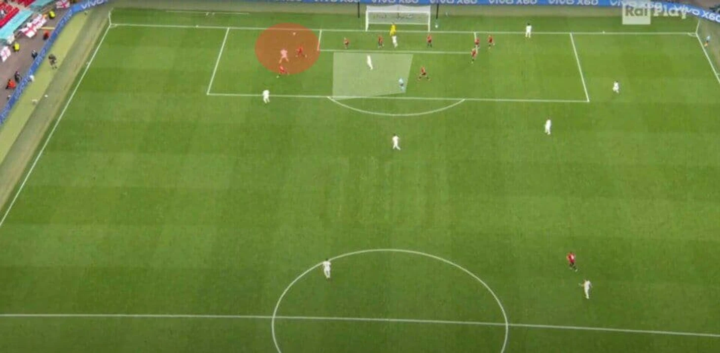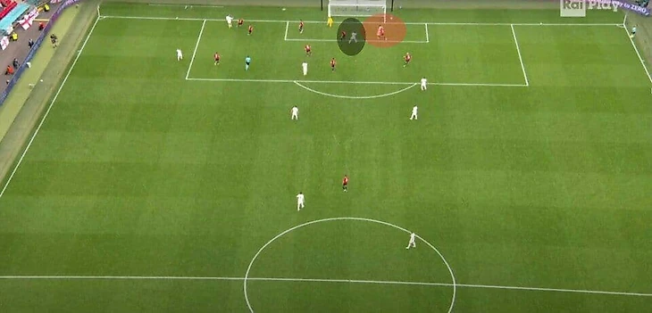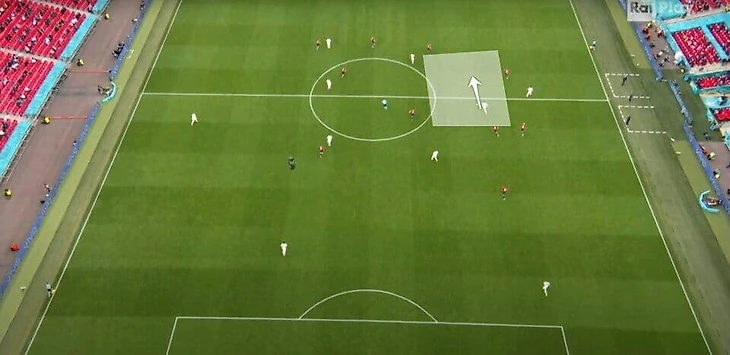 Сака подаёт в штрафную, игроков внутри штрафной, ожидающих навес Сака - 3, но они были разобраны игроками Чехии, да и сами игроки Англии не предлагают никаких действий (например: скрещивания, хаотичные движения). Обратите внимание, что на подборе - сразу 3 игрока + два защитника остались ниже (само собой).