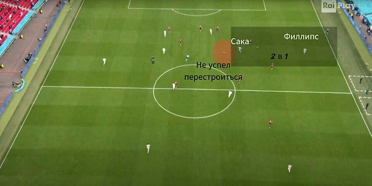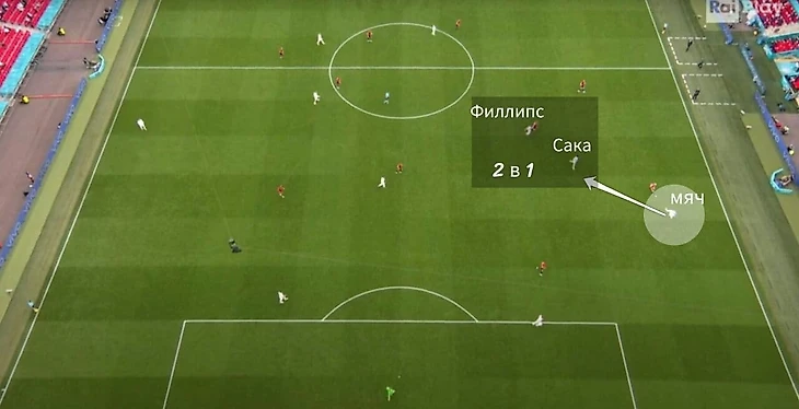 Дальше всё же полузащитник передал своего оппонента, но не успел перестроиться: Сака забежал в пространство, создал ситуацию 2 в 1 на фланге, пасовал на Филлипса: