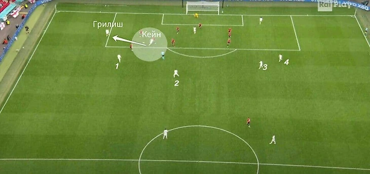 За Кейном вышли игроки Чехии, но Кейн сумел отдать пас обратно на Грилиша, хоть и стоял спиной. Кстати, посмотрите, теперь на подборе 4 игрока у англичан и 2 центральных защитника ниже: