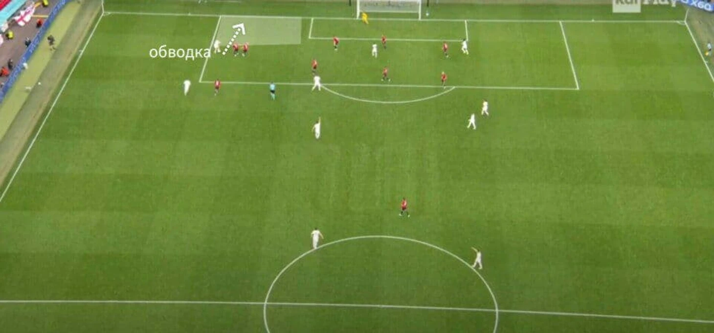 В штрафной - 3 игрока англичан(кроме самого Грилиша), непосредственно ожидающих мяч - 2. Но даже в таких условиях, они умудряются забить гол. Два игрока, два низких игрока - Сака и Стерлинг, за счёт прекрасного взаимодействия, а именно - скрещивания, создают момент для себя и забивают. Ну и подача Грилиша была классной: