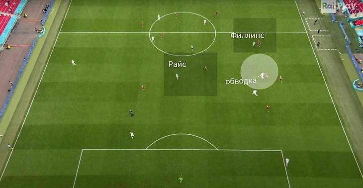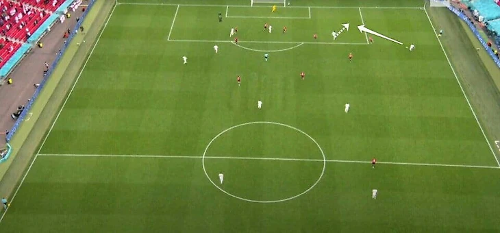 Стоунз пасует мяч на правого защитника Уокера, а тот - на опустившегося ниже Сака. За счёт опускания вниз Сака освободился от опеки левого защитника Чехии (если бы он пошёл за ним, за спиной оставил бы огромное пространство), создал ситуацию 2 в 1 в центре против полузащитника Чехии, который опекал Филлипса, и получил мяч свободно: