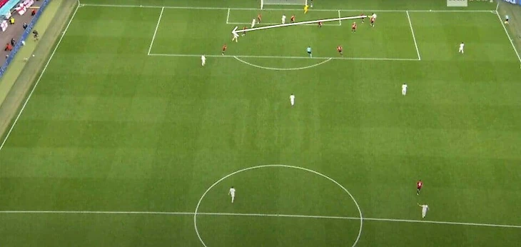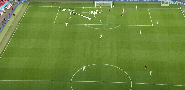 Подача Сака оказалась чуть сильной, но правый защитник проигрывает Грилишу в верховой борьбе и легко даёт ему скинуть мяч на Кейна. К тому же, Кейна можно было накрыть ещё до получения мяча, но игроки опять реагируют поздно: