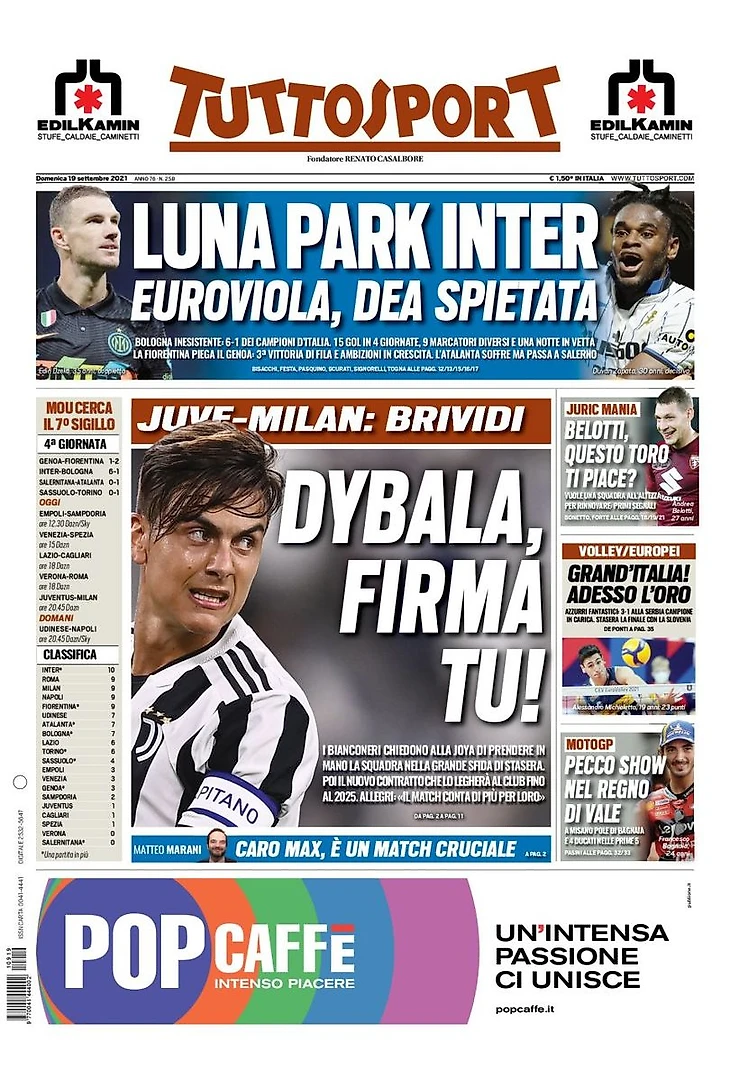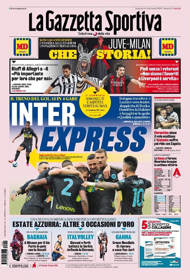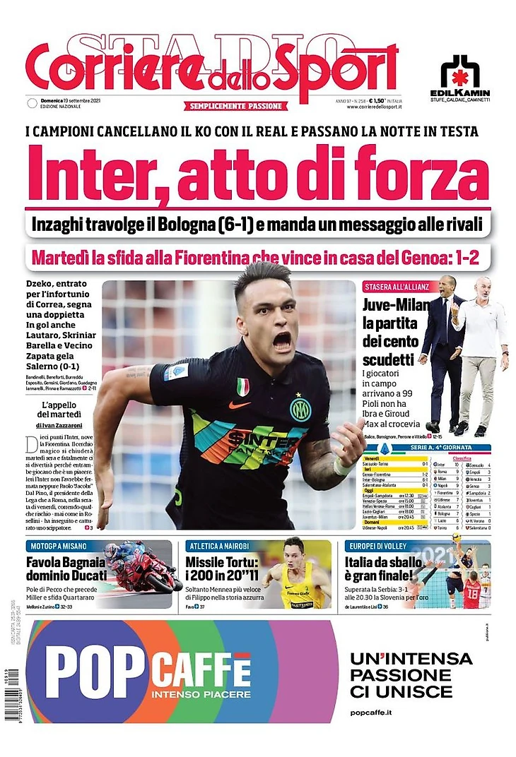 Чемпионы забыли поражение от «Реала» и на одну ночь взошли на вершину таблицы. Индзаги разгромил «Болонью» (6:1) и отправил послание соперникам. Во вторник схватка с «Фиорентиной», которая выиграла в гостях у «Дженоа»: 1:2. Джеко, вышедший из-за травмы Корреа, сделал дубль. Забили также Лаутаро, Шкриньяр, Барелла и Весино. Сапата заморозил Салерно (0:1).