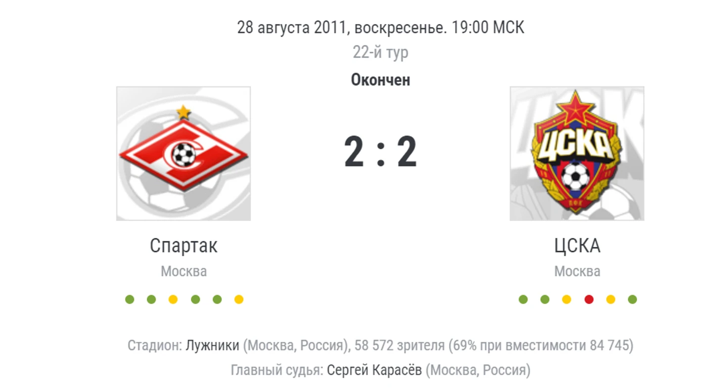 Спустя три дня "Спартак" принимал дома ЦСКА. Обслуживал встречу Сергей Карасёв. Матч закончился результативной ничьёй 2-2. Но больше всего игра запомнилась жуткой травмой Игоря Акинфеева. Бразилец Веллитон не убрал ногу, а сборная России потеряла своего первого номера.
