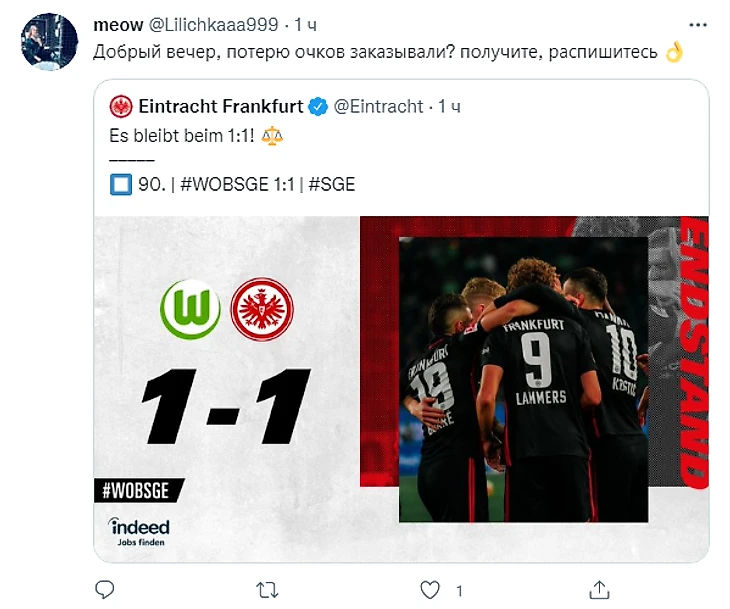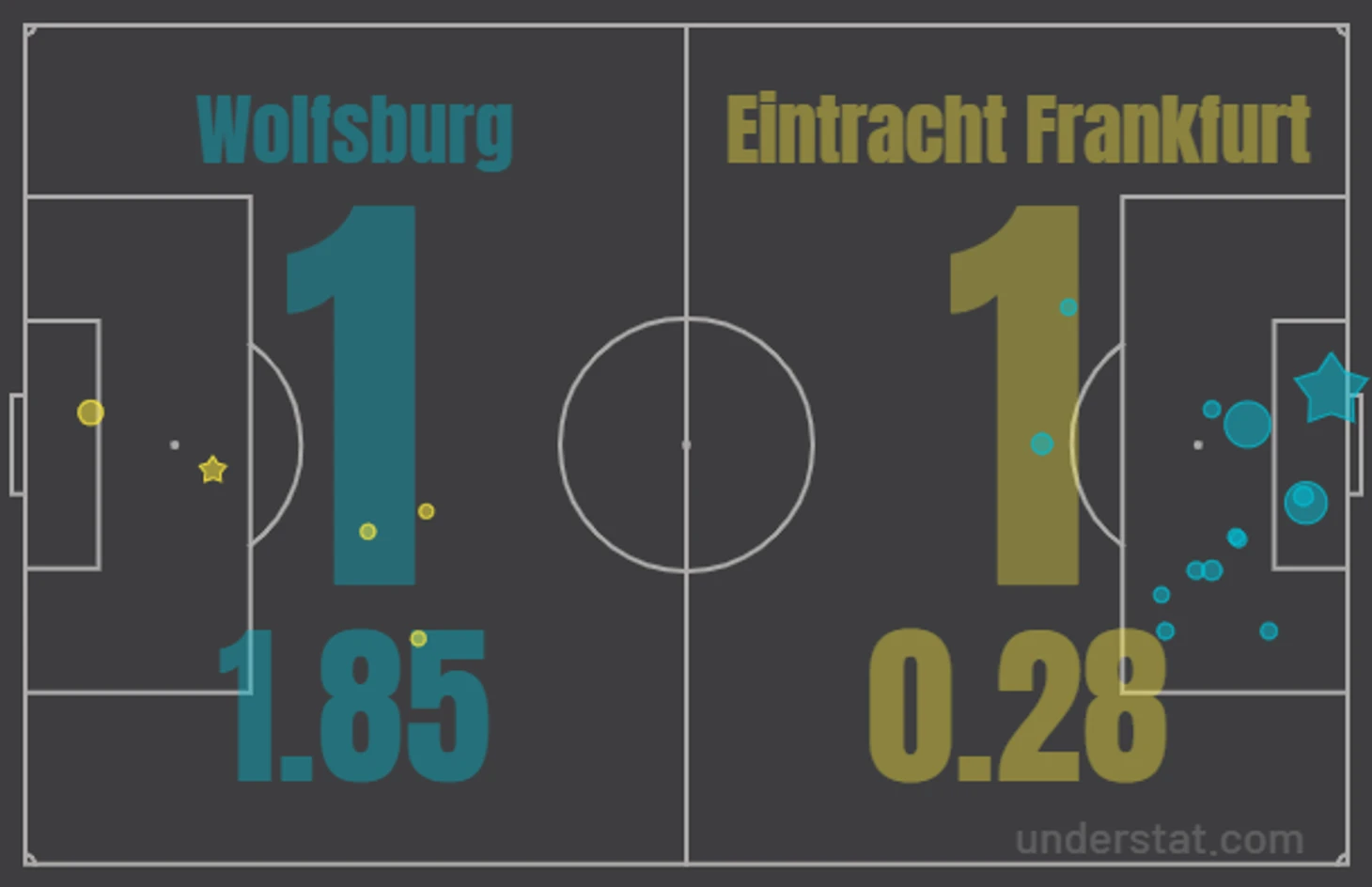 Однако, гости смогли дать бой лидеру чемпионата и испортили им красивую статистику при этом продолжив гнуть свою линию. Игра снова закончилась миром, а в ходе матча отличился вратарь «орлов» Кевин Трапп, который парировал ряд опасных ударов и сделал несколько сейвов. Даже в пропущенном мяче, он до последнего пытался спасти ситуацию, но тщетно. В результате, «Айнтрахт» вновь теряет очки, а «Вольфсбург» – первую строчку в чемпионате.