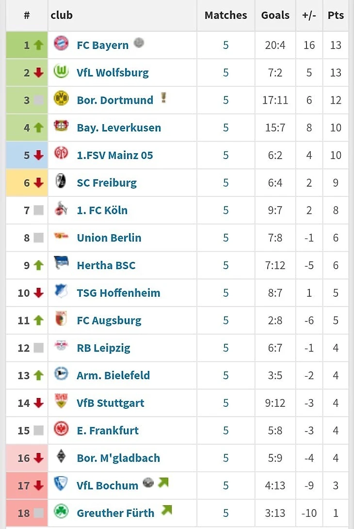 Победа «Баварии» позволила догнать ей «волков» в турнирной таблице. Пока что именно эти две команды возглавляют чемпионат. Впереди у мюнхенцев игра против другого аутсайдера «Гройтер Фюрта», правда этот раз матч пройдёт на выезде.