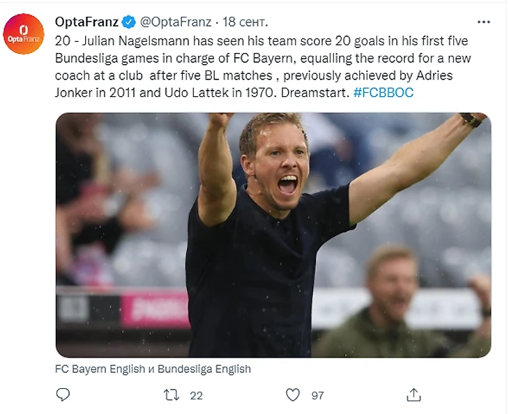 Юлиан Нагельсманн - третий тренер в истории «Баварии», при котором «Бавария» забивала 20 голов в первых пяти матчах Бундеслиги, первым таким тренером был Удо Латтек в 1970 и Андреас Йонкер в 2011 году