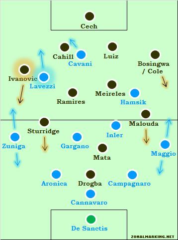 Игра была интересной из-за столкновения различных стилей, но ключ к победе находился в зоне правого защитника Челси. Бранислав Иванович играл крайне атакующую роль на поле, он размещался очень высоко, что позволяло Старриджу смещаться ближе к центру. Он часто владел мячом, и совершил около 53 проходов(Коул и Босингва в сумме только 35), интерестно, что Эсекиель Лавесси не следовал за ним до самого конца. С отходящими назад вингер-бэками защитная линия Наполи увеличивалась до 5 игроков. Вместе с обороняющимися полузащитниками, игроков несущих защитные обязанности становилось 7. Лавесси мог позволить себе оставаться гораздо выше и прорываться в пространство, оставленное Браниславом Ивановичем. Кроме этого Кавани часто смещался на левый фланг, тем самым перегружая работой Гари Кэйхилла.