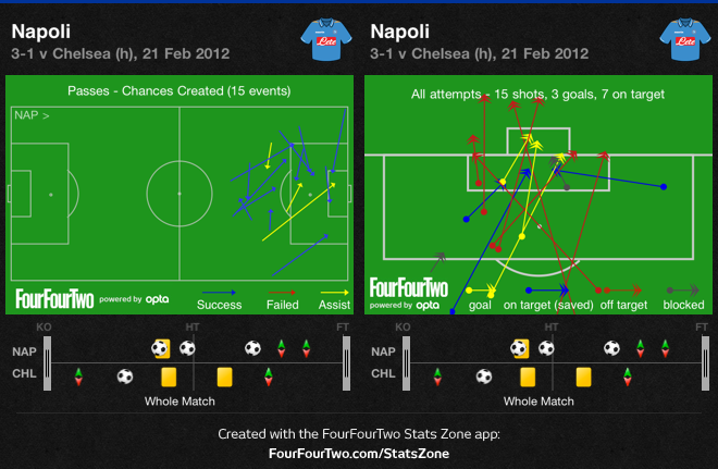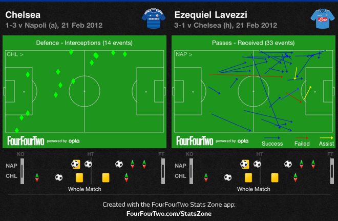 Наполи начинает игру частыми длинными передачами в зону между Ивановичем и Кэйхилом, например Лавесси в первые пять минут пытался принять передачи от Паоло Каннаваро. Это было опасным знаком и далее случилось еще не меньше, чем 7 ключевых событий с Лавесси или Кавани в зонах ответственности Бранислава Ивановича и Гари Кэйхила: