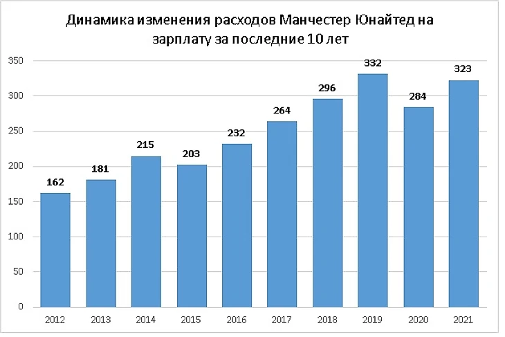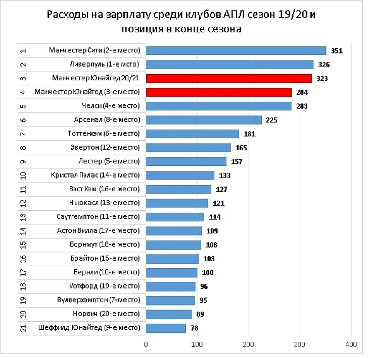 Манчестер Юнайтед потратил 323 млн. фунтов на зарплаты в прошлом сезоне. Рост по сравнению с сезоном 19/20 составил около 14%. В первую очередь это может быть связано с бонусами, выплаченным игрокам за групповой этап Лиги Чемпионов, а также попаданием в финал Лиги Европы. По расходам на заработную плату среди клубов АПЛ он также находится среди лидеров.