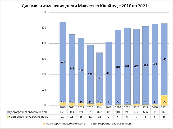 Текущий долг клуба составляет 530 миллионов фунтов, из которых 65 миллионов краткосрочная задолженность (должна быть погашена в течении 12 месяцев) и долгосрочная задолженность (погашается более 12 месяцев) на сумму 465 млн. фунтов. Данный долг выглядит внушительно, но при этом на данный момент, не является самым большим в АПЛ.