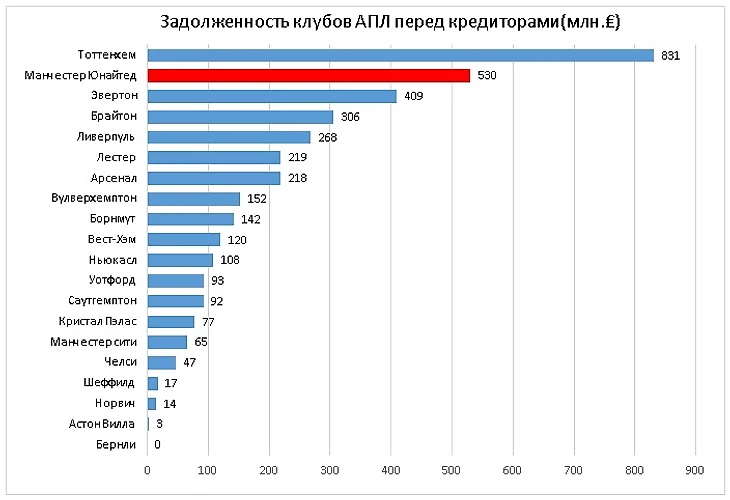 Лидером по размеру кредиторской задолженности является Тоттенхэм, который брал кредит на строительство нового стадиона. Манчестер Юнайтед занимает почетное второе место. Как мы видим, практически все клубы имеют кредиторскую задолженность, при этом наличие кредиторской задолженности таких размеров не должно пугать. Наиболее важным аспектом является не наличие такого долга, а возможность его обслуживания, с чем клубы АПЛ на сегодняшний момент справляются. Насчет МЮ переживать точно не стоит, его владельцы будут делать все возможное для успеха такого клуба, тем более если он приносит им деньги.