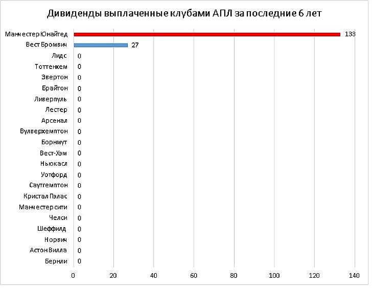 Манчестер Юнайтед выплатил 136 миллионов фунтов за последние 6 лет семье Глейзеров. Из всех клубов АПЛ только Манчестер Юнайтед и Вест-Бромвич выплачивали дивиденды своим владельцам. Учитывая, что Вест-Бромвич сейчас выступает в Чемпионшипе, МЮ является единственным клубом, проявляющим такую заботу о своих владельцах.