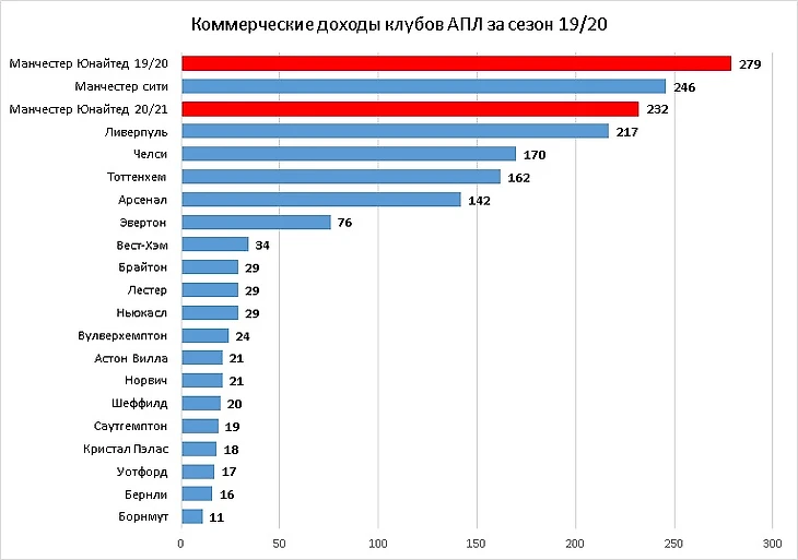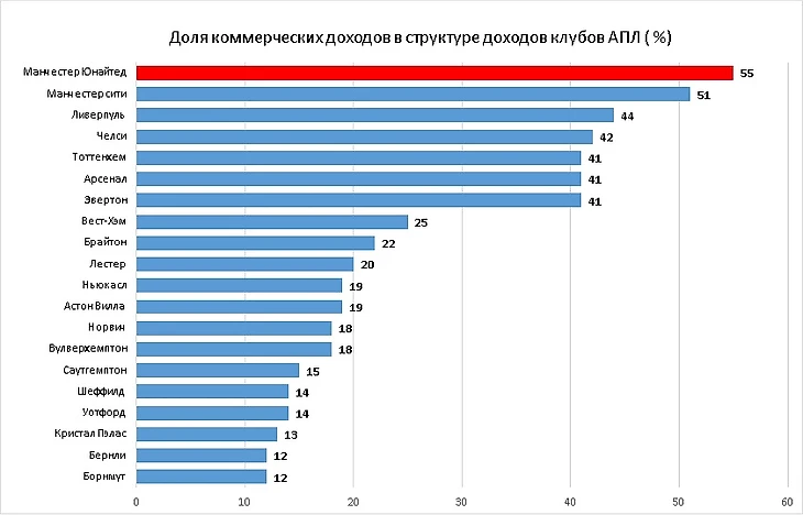 Манчестер Юнайтед - единственный клуб АПЛ, у которого доля коммерческих доходов в общей структуре доходов превышает 55%. Ближайшим конкурентом является Манчестер Сити, чьи спонсорские, а также иные соглашения всегда вызывают множество вопросов. У более прозрачного в этом отношении Ливерпуля, доля коммерческих доходов от общих доходов составляет только 44%. При этом в этом сезоне истёкшее спонсорское соглашение с "Chevrolet", сумма которого была 64 млн. евро заменил контракт с "TeamViewer" на 43 млн. евро. Уменьшение контракта на 17 млн. станет ощутимой потерей, однако в любом случае, такая доля коммерческих доходов в общей структуре доходов клуба, позволила Манчестер Юнайтед с меньшими потерями пережить сложный период . При этом, среди топ-20 клубов Европы по доходам, только у 2-х клубов доля коммерческих доходов от общей суммы доходов превышает 55% и один из этих клубов выступает в РПЛ( Ежегодный отчет аудиторской компании Deloitte).