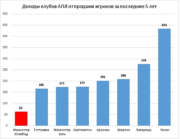 В долгосрочном периоде ситуация также не изменилась. МЮ зарабатывает на трансферах значительно меньше, чем остальные клубы из топ-6 АПЛ, а также Саутгемптон и Эвертон. Доходы клуба от трансферов находятся на довольно низком для такого крупного клуба как Манчестер Юнайтед уровне.
