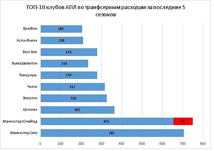 За последние 5 лет, не учитывая сезон 20/21, Манчестер Юнайтед потратил на трансферы игроков 655 миллионов евро. Такая внушительная сумма делает его одним из лидеров по тратам на трансферном рынке АПЛ.