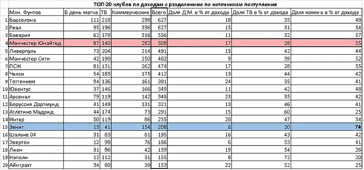 Только Мюнхенской Баварии (57% в общей структуре доходов) и Зениту (74% в общей структуре доходов) коммерческие доходы приносят больше, чем Манчестер Юнайтед. Данный факт, еще раз подтверждает высокую значимость и эффективность данного вида доходов для МЮ.
