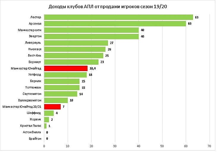 При этом, несмотря на то, что МЮ обладает одной из наиболее развитых академий в Англии, а также привычным скоплением звездных игроков, клуб абсолютно не зарабатывает на трансферах. Доход от трансферов за сезон 20/21 составил скромные 7 млн. евро, а сезон 19/20 также был не намного прибыльнее и принес клубу всего 18,4 млн. евро. При сравнении с остальными клубами АПЛ мы увидим следующую картину: