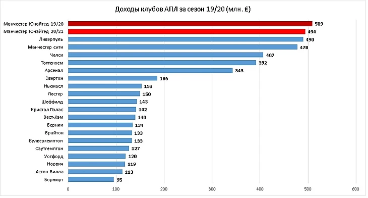 Несмотря на все негативные последствия пандемии, Манчестер Юнайтед сохраняет за собой звание клуба, с наибольшими доходы среди всех клубов Английской Премьер-лиги.
