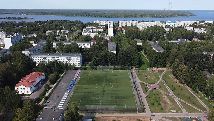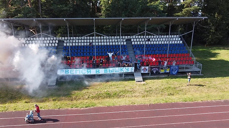 Вдоль неблагоустроенной набережной, которая привела нас к "пьяному" мосту мы добрались до соснового бора. Именно в этом историческом лесу и расположен нужный нам стадион. С середины 00-х годов на местном стадионе был свой фансектор, ну а в приезде гостей из Удомли сомневаться не приходилось.