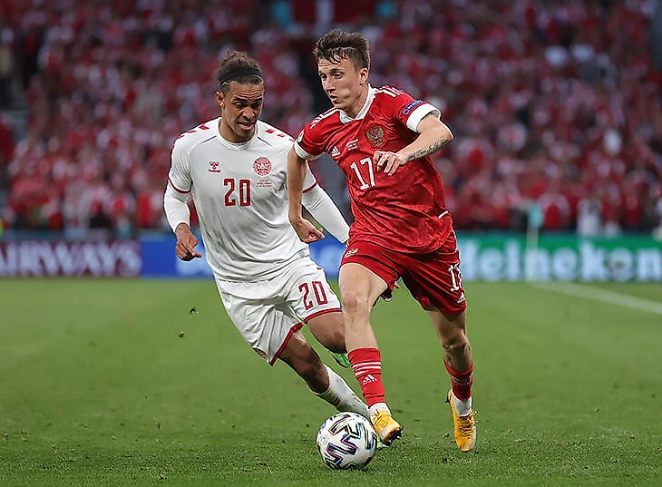 • против Дании: хорошая организация без мяча – попытки прессинговать высоко, но своевременный отход в низкий блок, если прессинг проваливался. По мнению экспертов, у Дании не было моментов до гола Дамсгора дальним ударом. Он все перевернул. Также есть похвала Юлманду, который хорошо отреагировал на попытки России раскрыться во втором тайме. Тренер Дании перестроил команду на схему 3-5-2, что привело к «двум выдающимся голам – изящной атакующей комбинации и резкой контратаке».